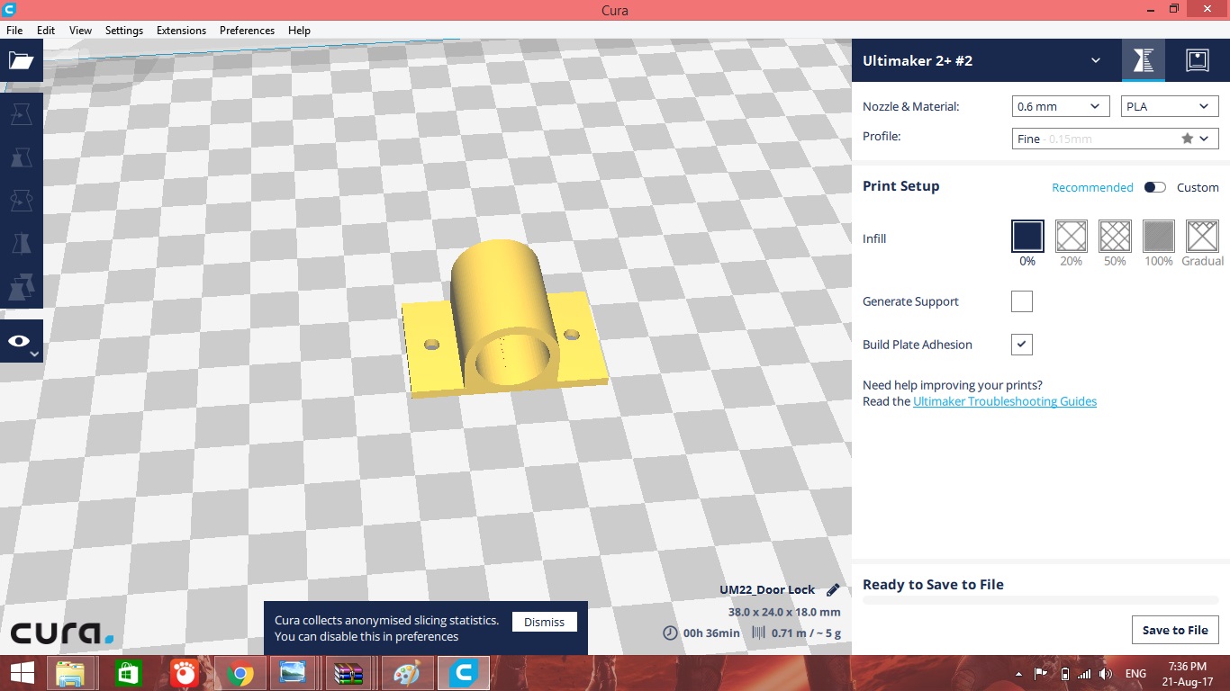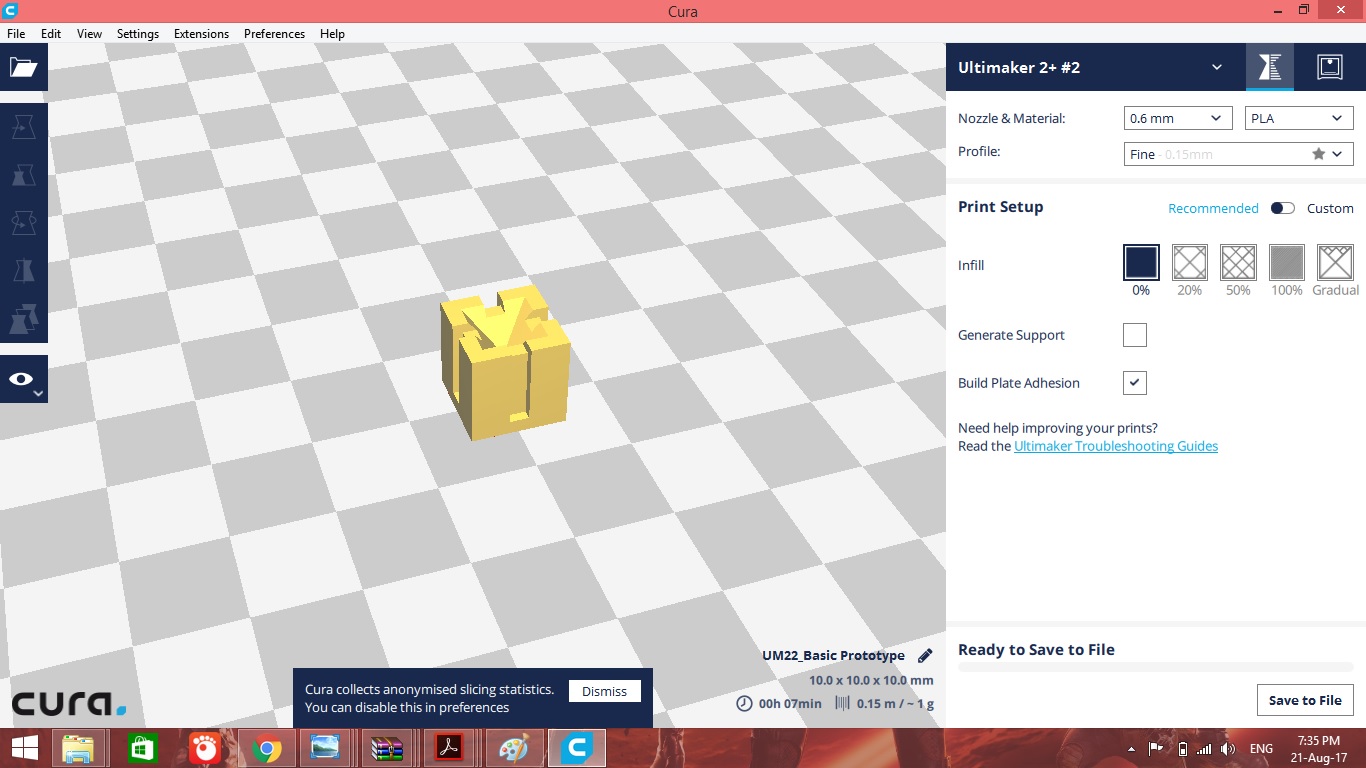 The .3dm file is converted to .stl fil to be edited in Cura software, for adding support structure, analysing dimensions and build time.