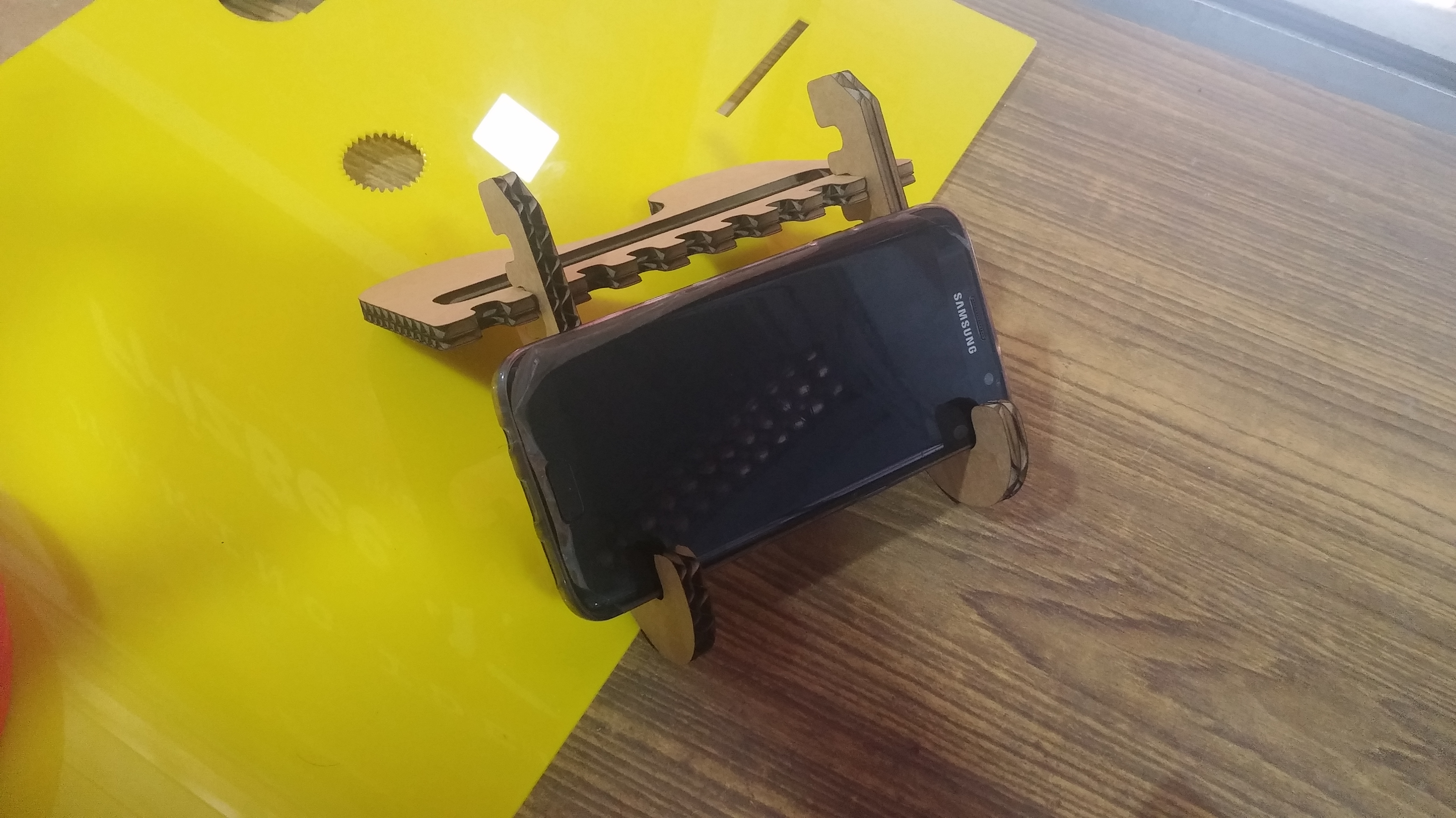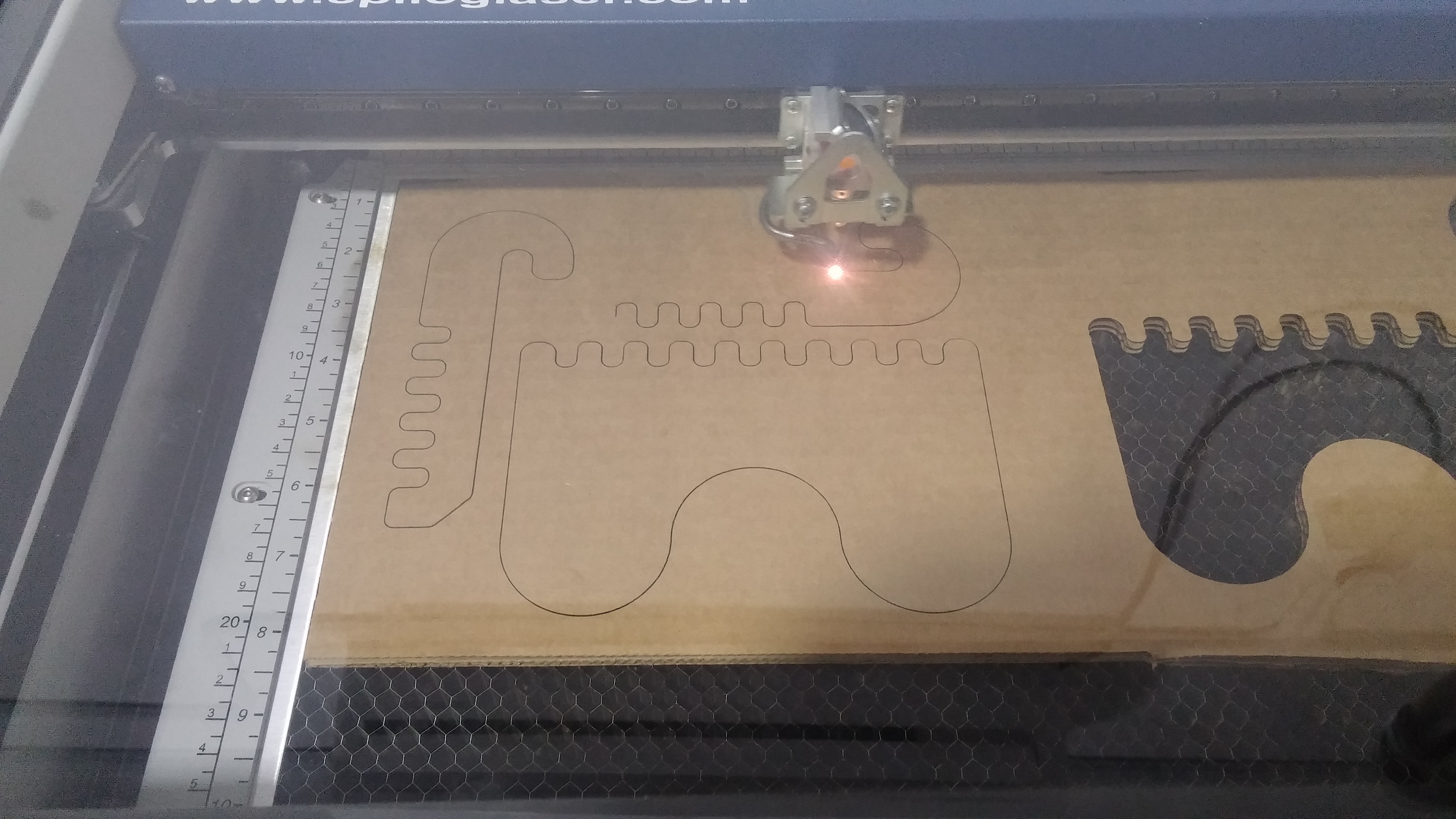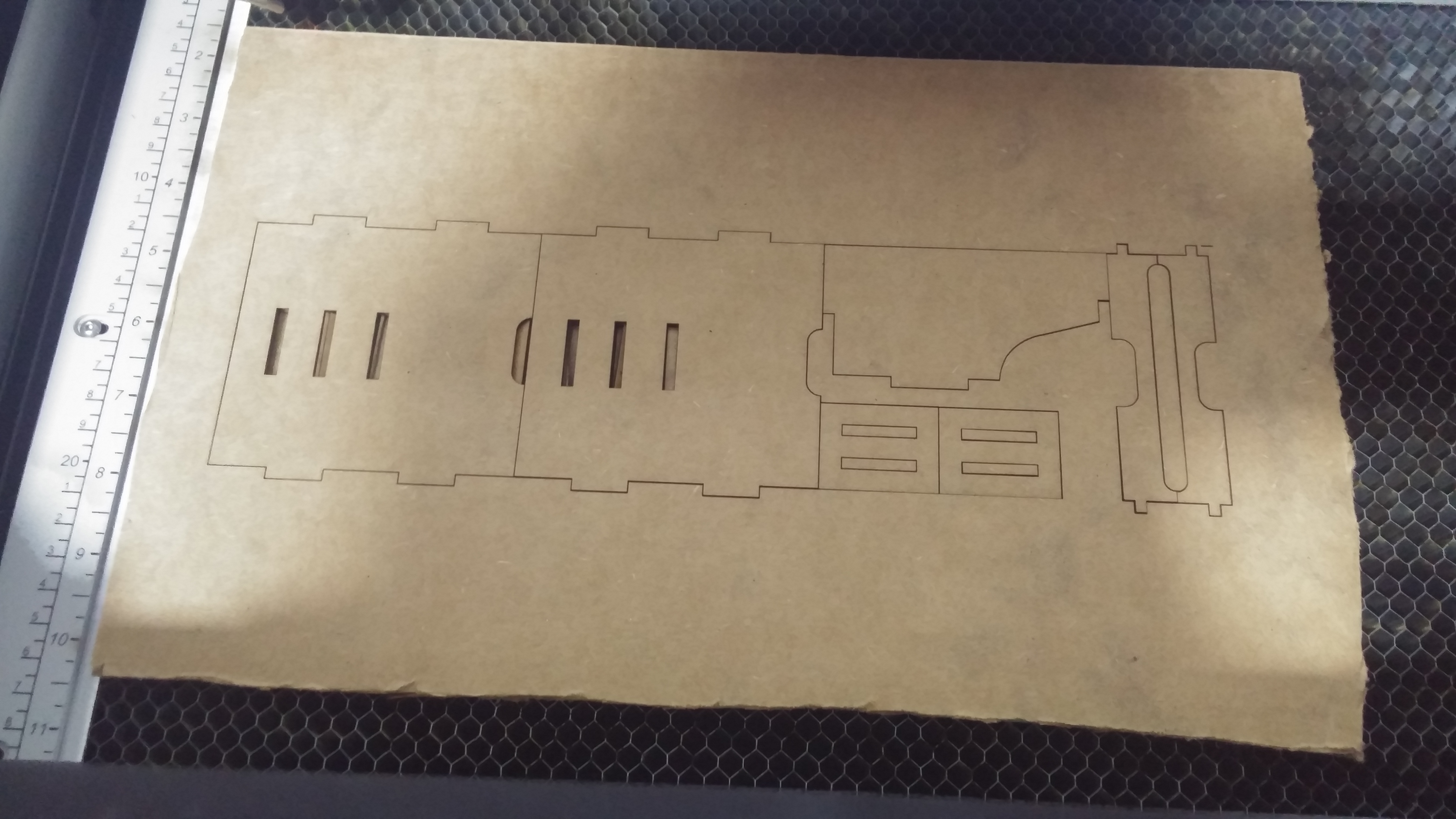 The .3dm file is printed usiing the laser cutter on a 6mm thick cardboard under 100% power. After an approximate cut time of 2 minutes, the cut piece of the protoype was obtained.